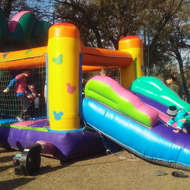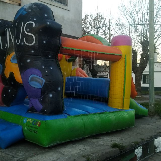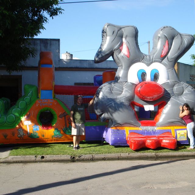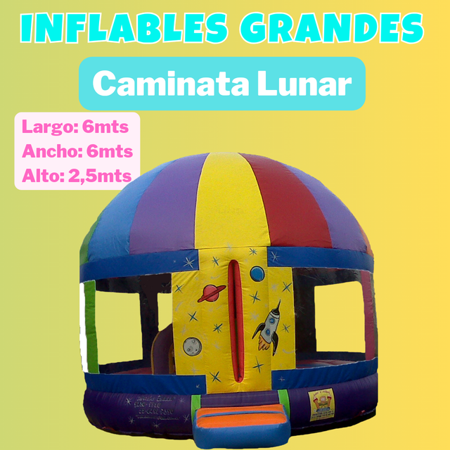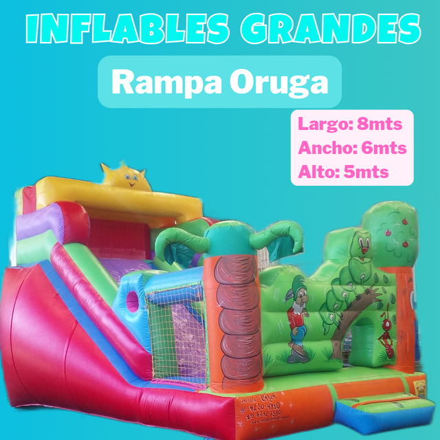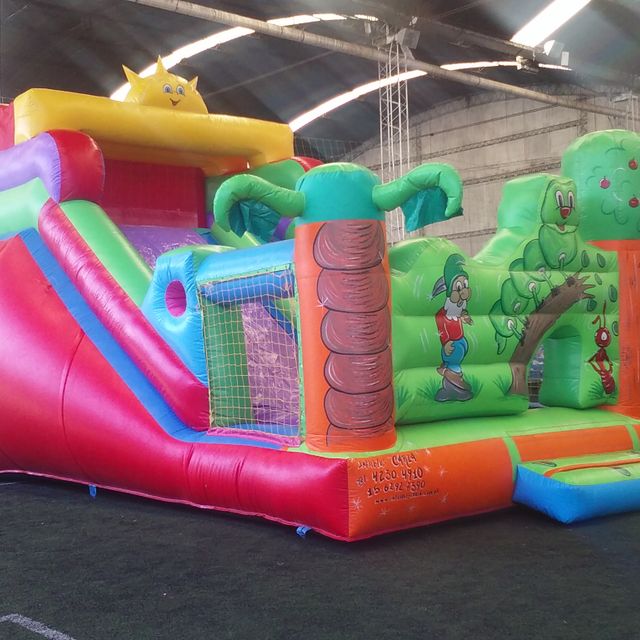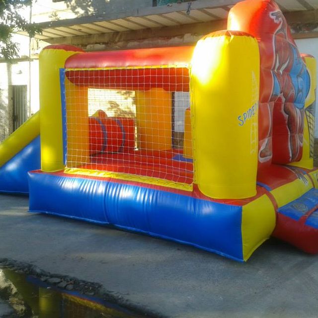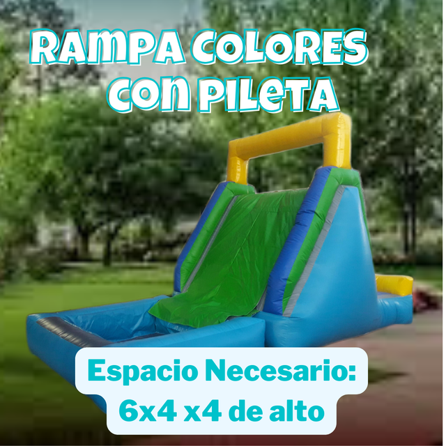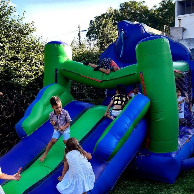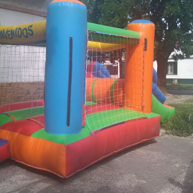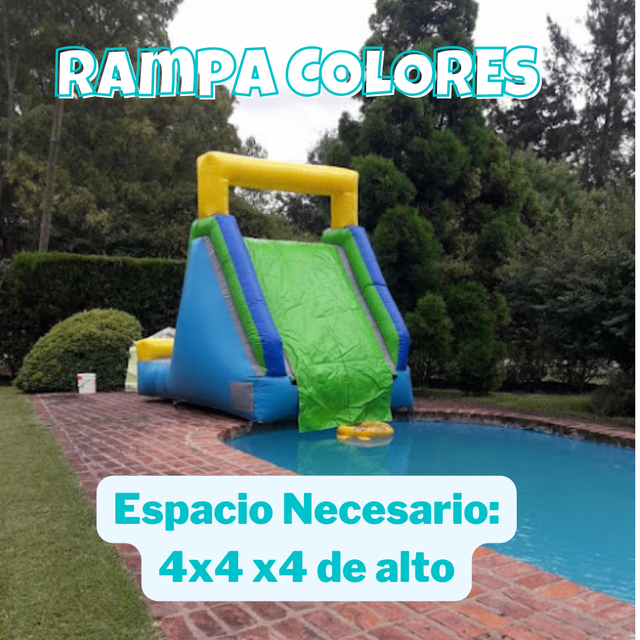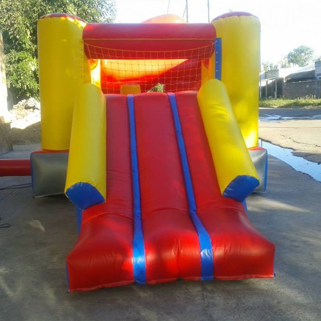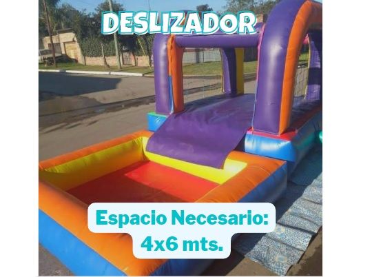 Para este inflable necesitas un espacio de 4x6 por 3 mts de alto. Tiene el tobogan en la parte de atras.