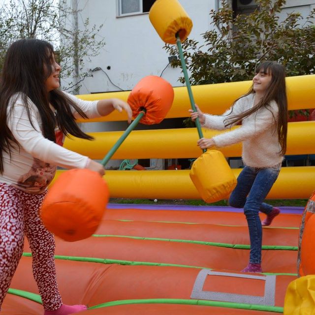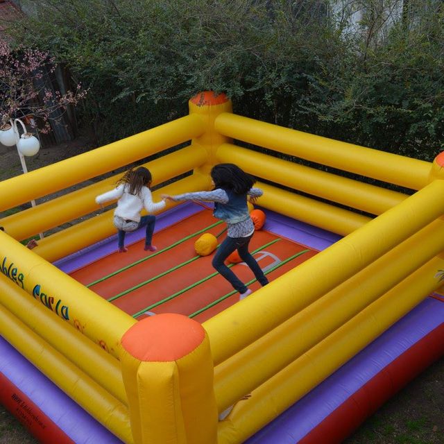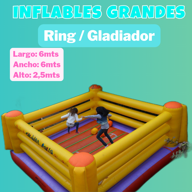 Para este inflable necesitas un espacio de 6x6, lo podes pedir como ring (con guantes) o Gladiador (con puff e hisopos) o combinar ambos x una minima diferencia.
