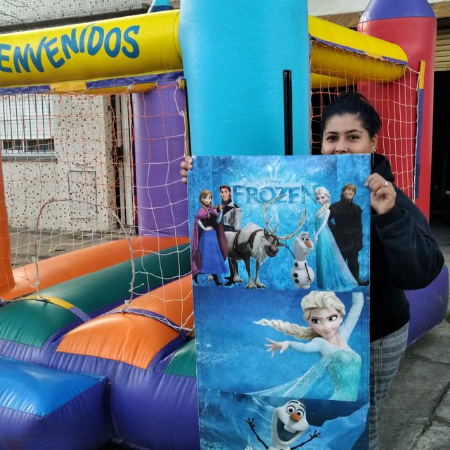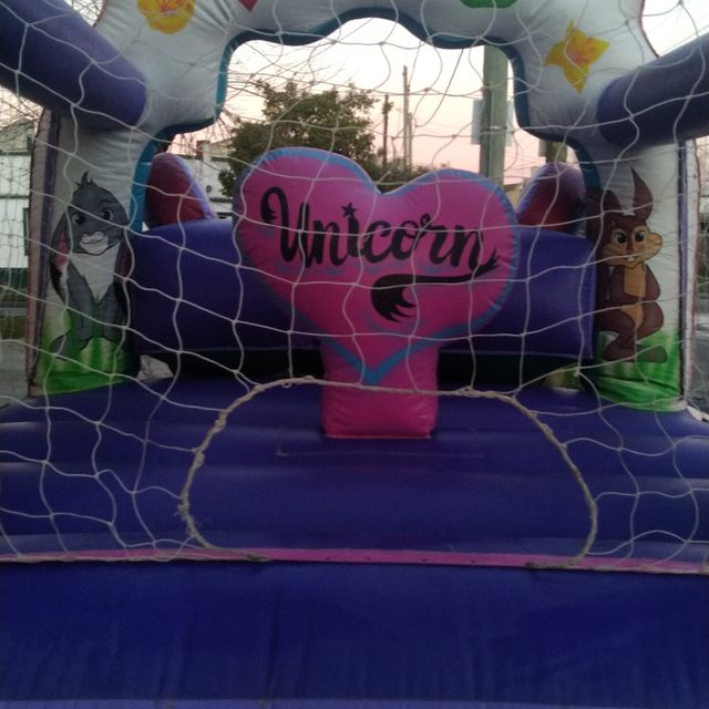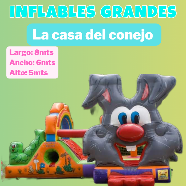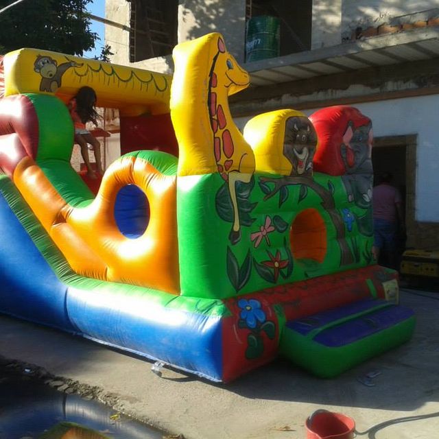 Para este inflable necesitas un espacio de 4x6 por 4 mts de alto. Tiene el tobogan en la parte de atras.