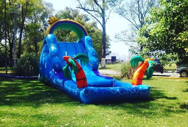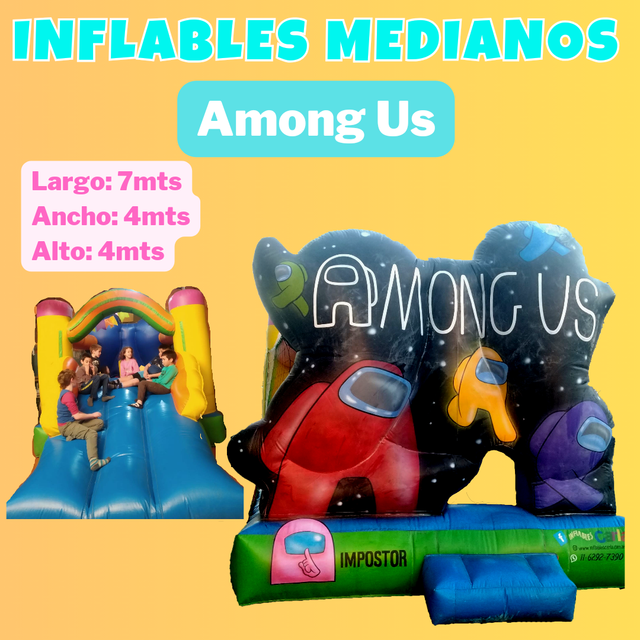 Para este inflable necesitas un espacio de 4x7 por 4 mts. de alto. Tiene el tobogan en la parte de atras.