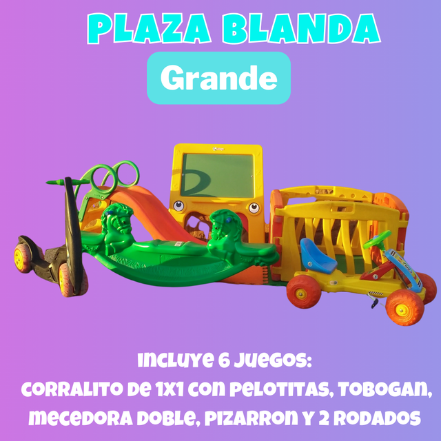 Incluye: Corralito con pelotas, tobogán, mecedora doble, pizarra, monopatín, karting y 2 pisos de goma eva.